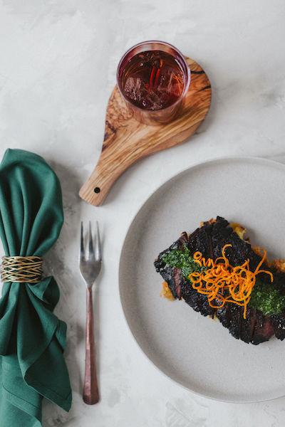 Global flavors defines the menu at The Alchemists’ Garden with options such as coffee rubbed skirt steak, pesto vegetable lasagna, and tiger prawns; Cody notes that “a fan favorite is our bone marrow appetizer that can be made into a luge.”