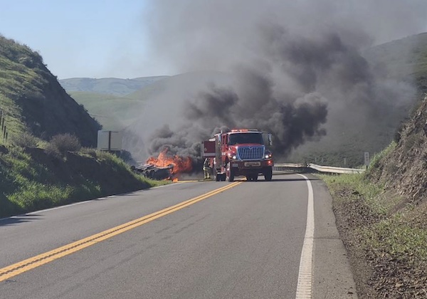 Officers received an initial report at about 12:40 p.m. of a vehicle that had overturned and caught fire on Highway 41 north of the Cholame Y. Although the vehicle came to rest off the roadway, thick black smoke from the fire reduced visibility for drivers, prompting authorities to close the highway in both directions.