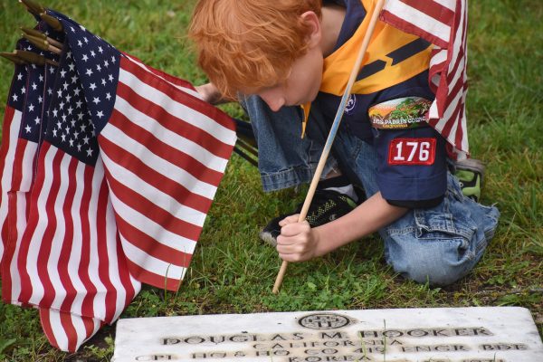 Chris Cardenas, Age 8, Cub Scout of Paso Robles Scout Pack 176 places an American flag at the grave of a veteran interred at Paso Robles District Cemetery as part of Paso Robles observance of Memorial Day.