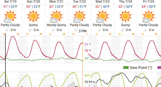 Tuesday, July 22, will be partly cloudy, with a high of 80°F and a low of 51°F. There’s a slight chance of rain around 3 p.m., though it remains minimal.